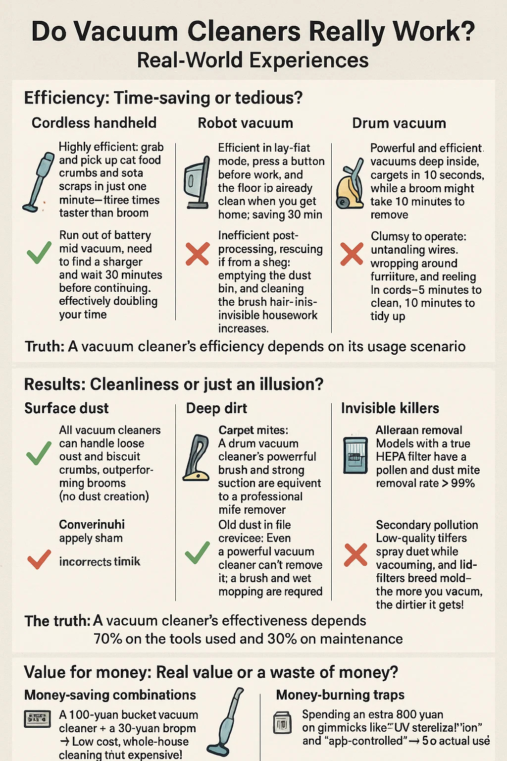 Vysavače bubnu: Výkonné a efektivní: Vysavače hluboko uvnitř koberců za 10 sekund, zatímco odstranění koště může trvat 10 minut. Nerom nemotorná operace: Rozmotání drátů, ovinutí nábytku a navíjení v kabelů - 5 minut na čištění, 10 minut, aby se uklidily. Pravda: Účinnost vakuového čističe závisí na scénáři použití.