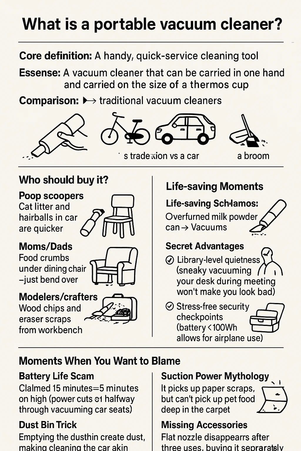 Essence: Vysavač, který lze přenášet v jedné ruce a nesený na cestách, obvykle o velikosti termoskového šálku.
